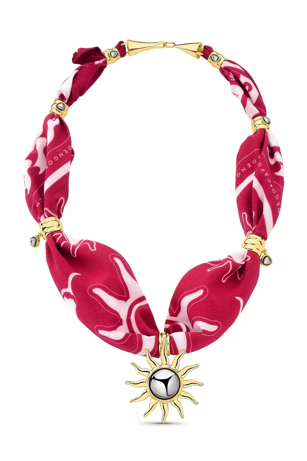 O Colar Solar Maria Dolores traz a força do verão em um design único. A bandana Vermelha, em tecido exclusivo que compõe o maxi colar, é o ponto de partida para essa criação ousada e sofisticada. Cada detalhe da estampa carrega os elementos da coleção, revelando um universo que mistura a leveza do La Dolce Vita com a energia vibrante do Brasil. O ajuste inteligente no tecido permite diferentes formas de uso: rente ao pescoço, para um ar bold, ou alongado, em um styling mais descontraído. No centro, o pingente de sol folheado a Ouro com núcleo em Ágata Cinza Metalizada ilumina a peça, enquanto detalhes metálicos e pequenos pingentes de pedra entre as dobras do tecido adicionam brilho e movimento. Já o fecho, em metal marcante, completa o design com presença e funcionalidade, permitindo o ajuste com um simples gesto. O Colar Solar é uma celebração do verão: a mistura do calor mediterrâneo com a brasilidade colorida, transformada em joia. Uma peça que carrega luz, estilo e uma intensidade doce, para quem ousa viver mais.